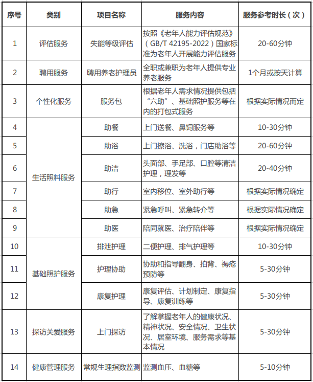 居家社区养老服务补贴项目清单